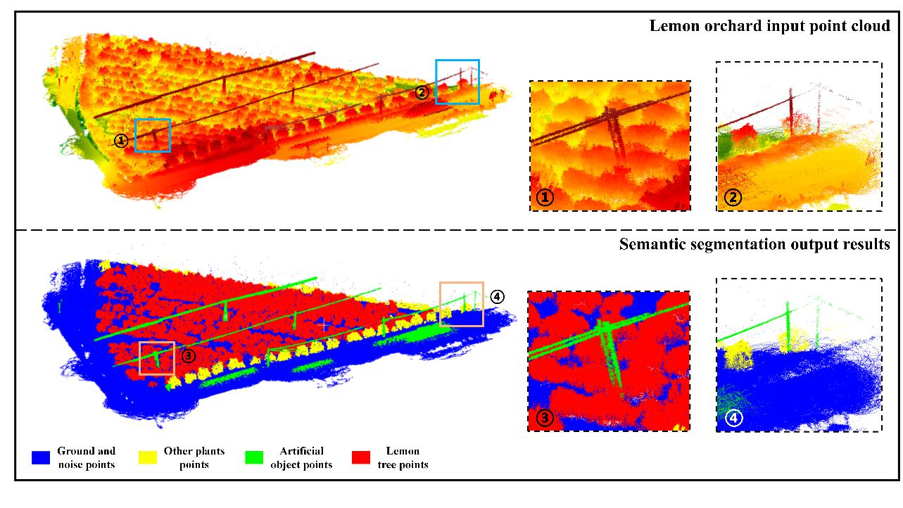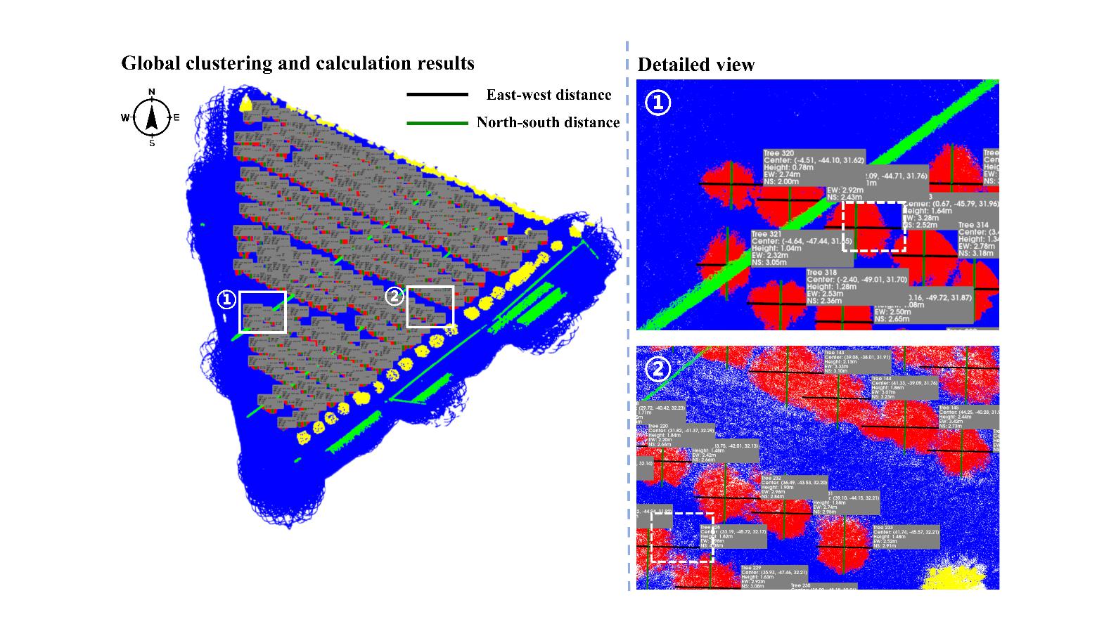 在环境理解与目标识别方面,研究引入了迁移学习策略:先利用PointNet++模型在大型公开三维点云数据集上进行预训练,使模型充分学习通用的空间几何特征与场景语义信息;再结合采集到的小样本果园点云数据进行微调与再训练,使模型能够针对果树、地面及人造设施等典型目标实现更为精准的识别与三维语义分割。基于分割得到的果树点云,研究进一步引入聚类与几何分析方法,实现单株果树的自动分割与编号,并自动计算每棵树的株高、冠幅以及中心位置等关键几何参数,完成由原始感知数据向结构化果树表型信息的自动化转换。研究结果表明,所构建的系统在复杂地形非结构化果园中的建图精度、语义分割精度以及单株参数提取稳定性方面均表现良好,可为果园生长监测、精准施药、产量评估等智能化管理任务提供可靠的数据支撑和技术保障。