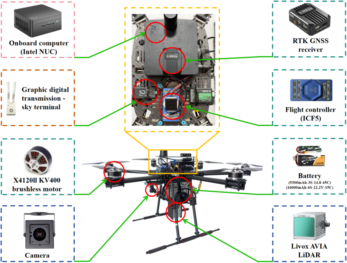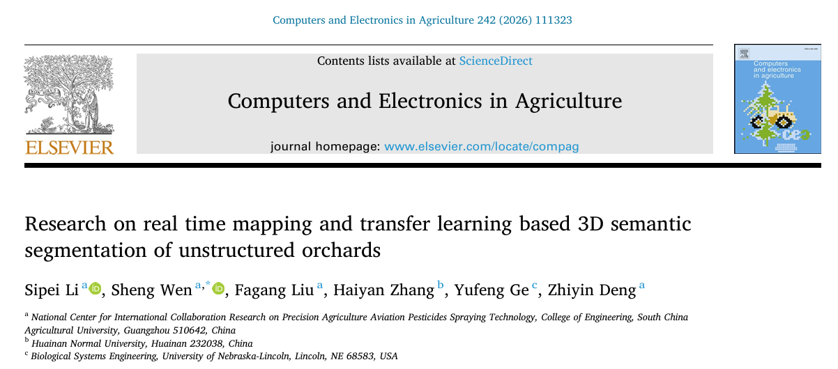 近期,我校工程学院硕士研究生李斯培以第一作者身份在在国际知名期刊Computers and Electronics in Agriculture(中科院一区Top期刊,影响因子8.9)发表题为“Research on Real Time Mapping and Transfer Learning Based 3D Semantic Segmentation of Unstructured Orchards”(https://doi.org/10.1016/j.compag.2025.111323)的研究论文。论文依托团队自主研发的智能感知无人飞行平台,该平台集成了激光雷达(LiDAR)、高精度全球导航卫星系统(GNSS)、惯性测量单元(IMU)等多源传感器,提出并实现了名为LIG-LIO的紧耦合激光雷达SLAM(Simultaneous Localization and Mapping),构建了面向非结构化果园环境的实时定位建图和语义地图生成系统,为丘陵山地非结构化果园三维点云地图的重建和语义映射提供了一种高效、准确的解决方案。