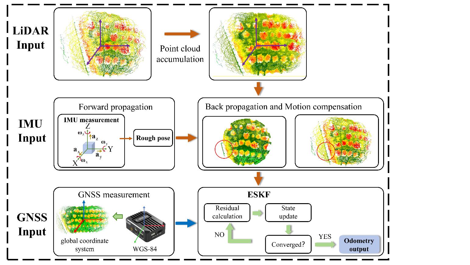 在实验流程上,研究首先利用搭载了激光雷达、高精度全球导航卫星系统等多种传感器的无人机平台,对丘陵山地非结构化果园开展多架次航测作业,获取高密度的原始三维点云。随后,为解决无人机在复杂地形飞行中易产生的地图垂直漂移问题,系统采用了一种多传感器紧耦合的建图方法,将高精度卫星定位信息与惯性导航及LiDAR里程计进行深度融合,对飞行姿态与轨迹进行持续约束与校正,从而构建出精度高、连续性好、在空间上全局一致的三维点云地图。