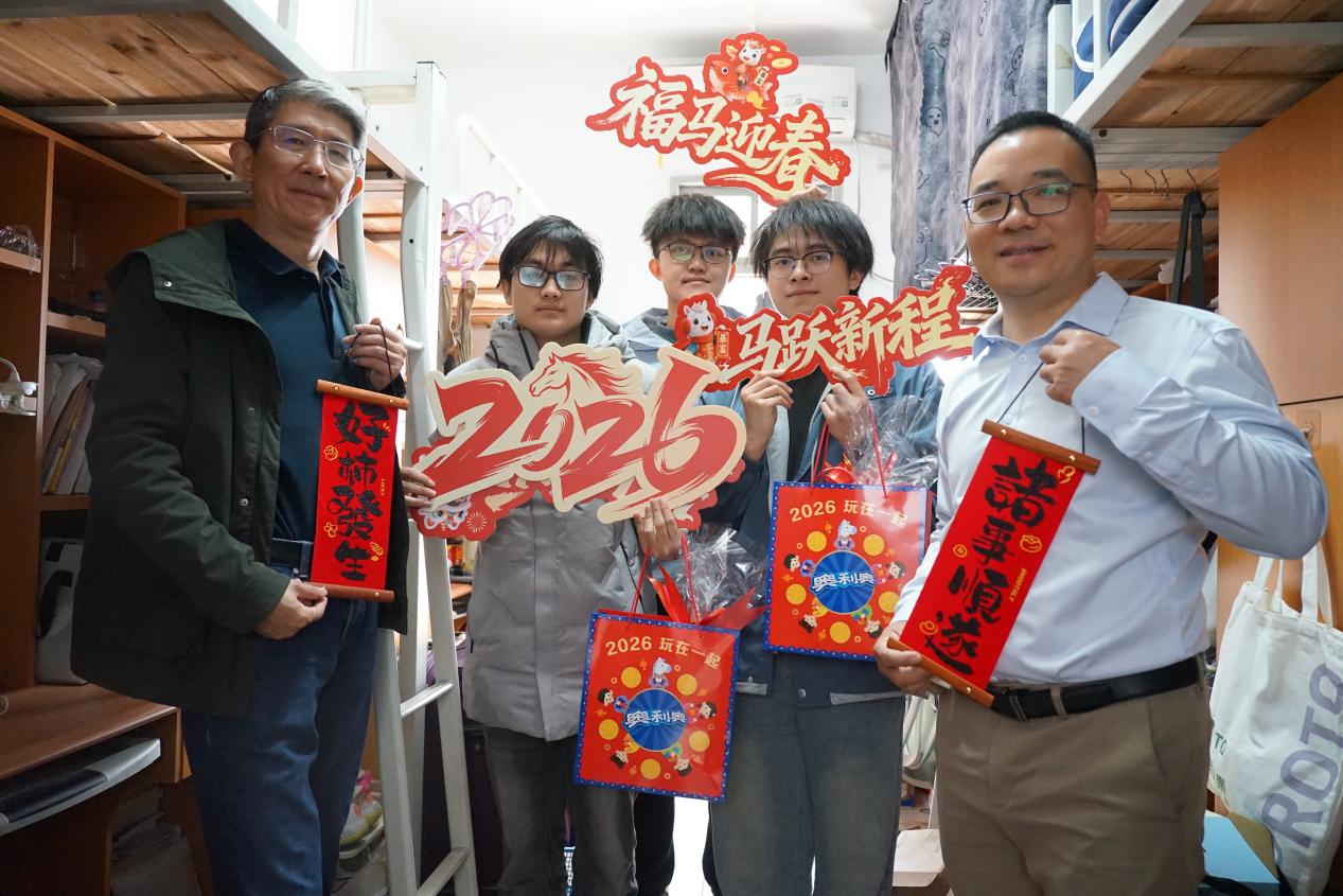 随后,学院领导班子一行来到泰山区学生宿舍,看望慰问留校学生。宿舍内,福字、新春挂饰等年味装饰点缀其间,暖意融融。领导班子仔细查看宿舍的居住环境、生活设施,详细询问同学们参与的实验项目进展、假期科研安排以及生活上的需求与困难,对大家主动参与科研项目、留校攻坚的钻研精神给予充分肯定。叮嘱同学们要严格遵守实验室与宿舍的双重安全规范,合理规划时间,注重劳逸结合,同时做好冬季防寒保暖与健康防护,尤其要注意用电安全和饮食卫生。学院为同学们准备了新春大礼包,全力保障大家留校期间的学习与生活需求。“学院领导的牵挂与关怀,让我们在小年这天倍感温暖与鼓舞。”留校同学表示,感谢学院为大家提供的坚实保障和贴心服务,接下来将全身心投入实验项目,用扎实的科研进展回馈学院的信任与期望,也会在留校期间及时给家人报平安,分享校园里的温暖与科研中的收获。