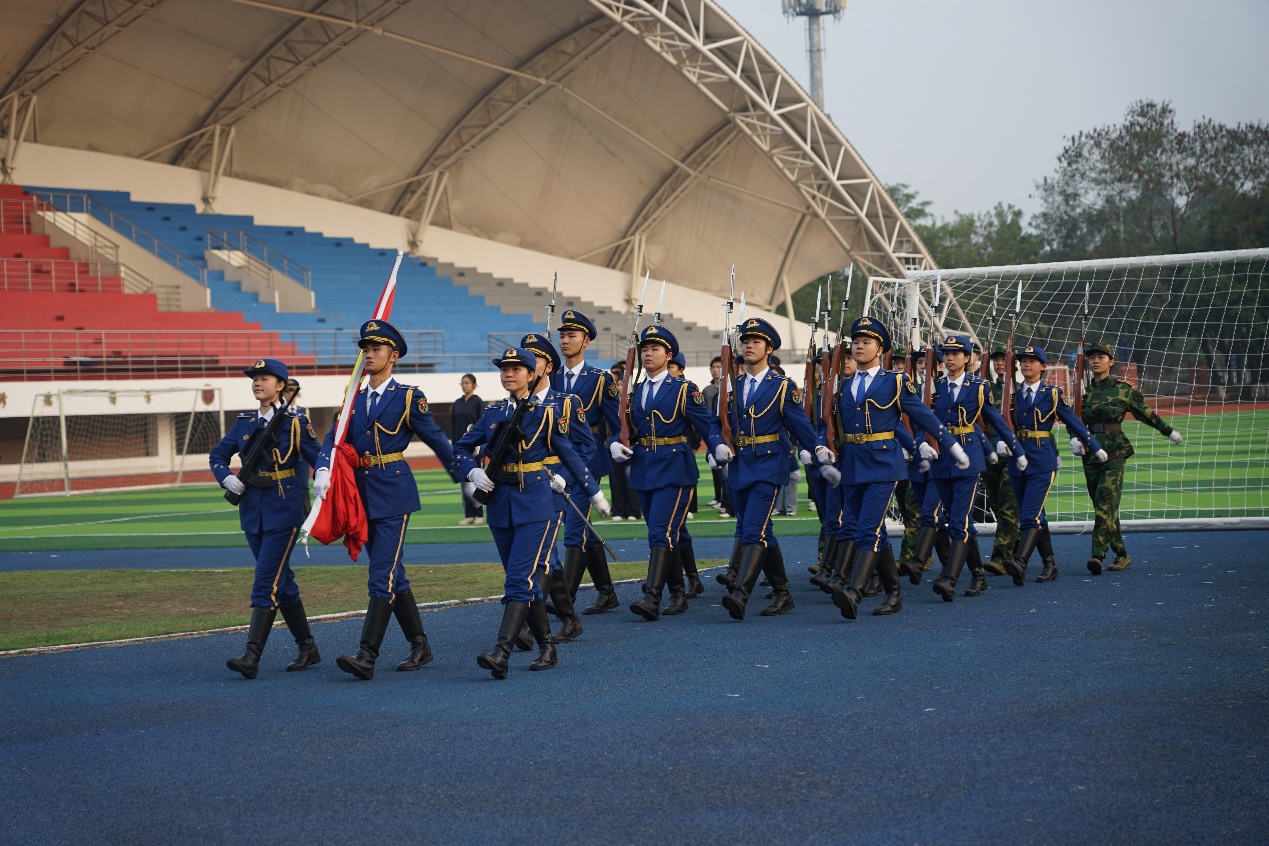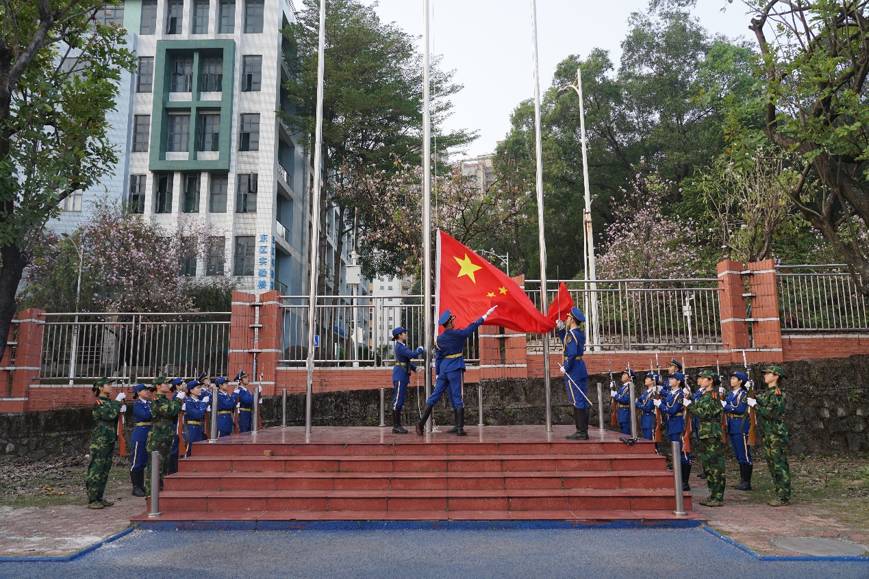 朝阳初升,清风拂面,升旗仪式第一项是迎国旗。国旗护卫队队员精神抖擞、步履铿锵,护卫着五星红旗稳步走向升旗台。全体师生肃立注目,现场氛围庄重肃穆,共同等待升旗仪式正式开始。
