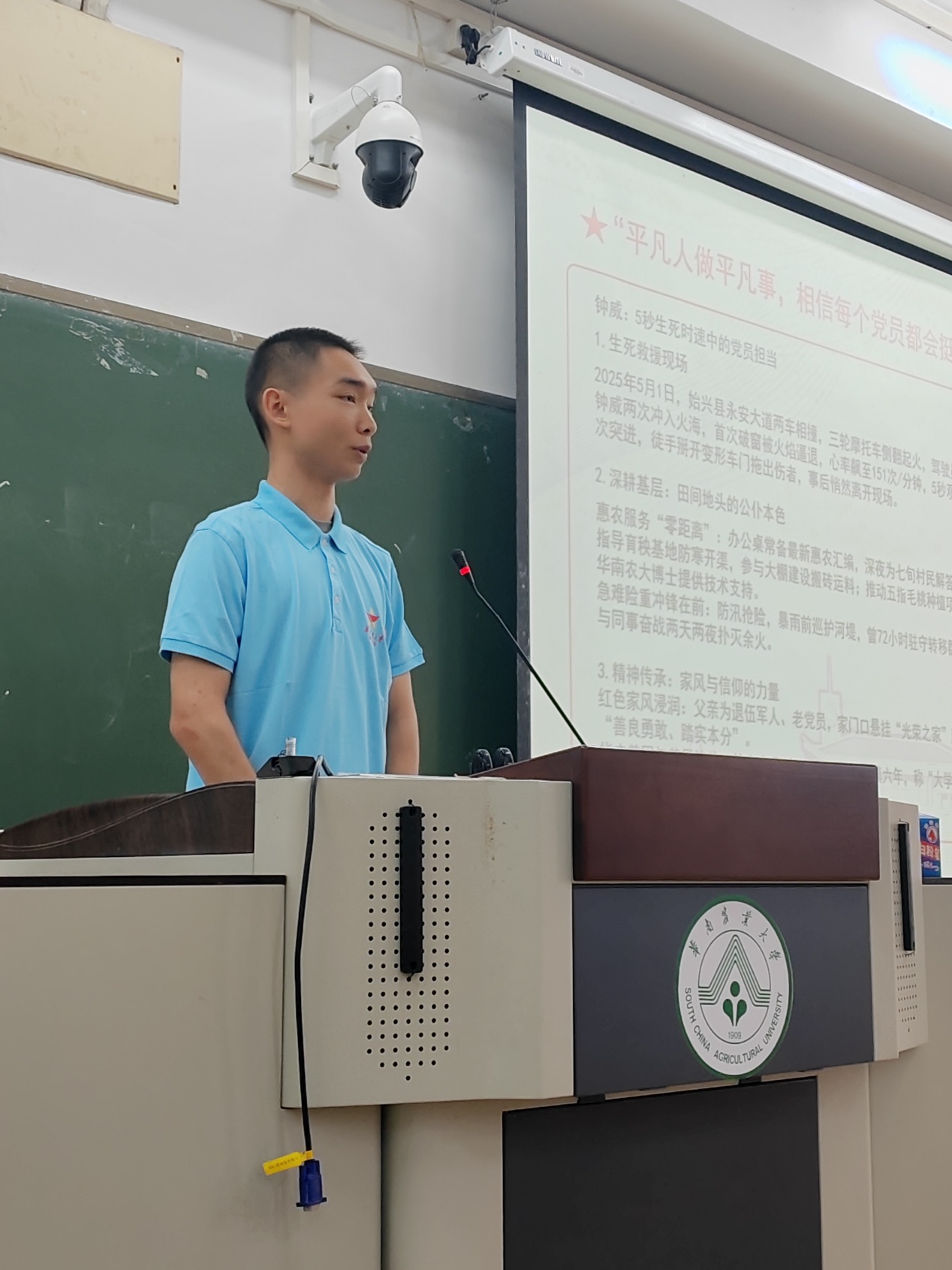宣讲现场特别融入华南农业大学先进典型事迹,用身边榜样凝聚奋进力量。从 “布衣院士” 卢永根忠诚报国、倾囊助学的赤子丹心,到 “农机战士” 罗锡文深耕田间、创新农耕技术的坚守担当,再到基层党员钟威火海救人、服务群众的先锋本色,鲜活案例让青马学员深受触动,深刻感悟华农人 “修德、博学、求实、创新” 的校训精神。